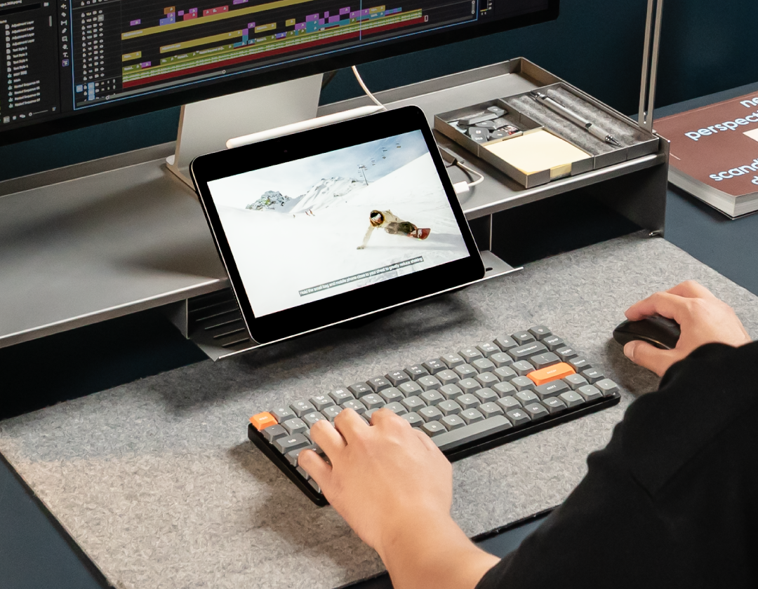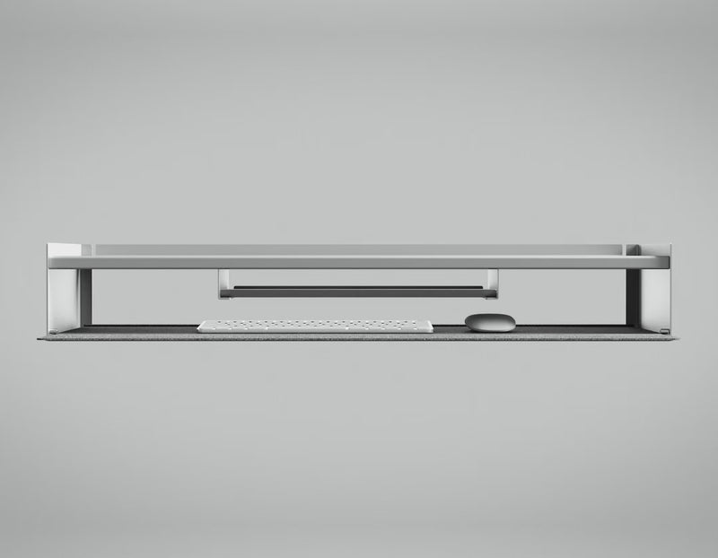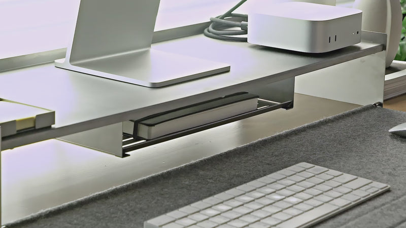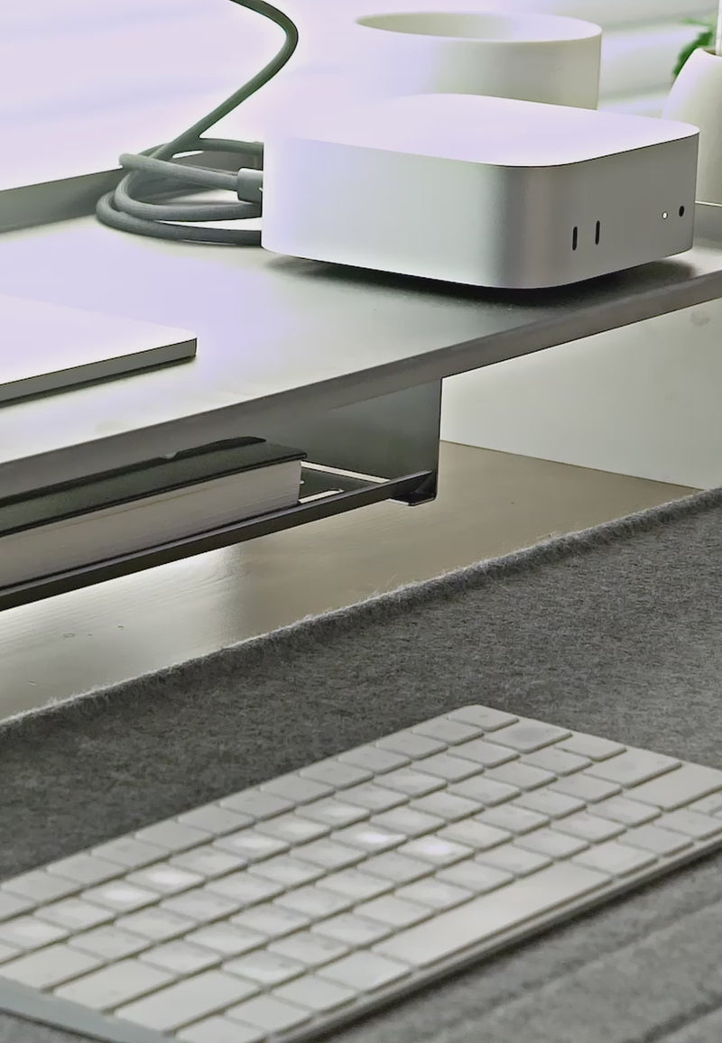 The accessory not only adds a storage space, but a hovering platform for peripherals like phones, cables, hubs, or even an iPad as a second monitor. When not in use, it slides back discreetly.