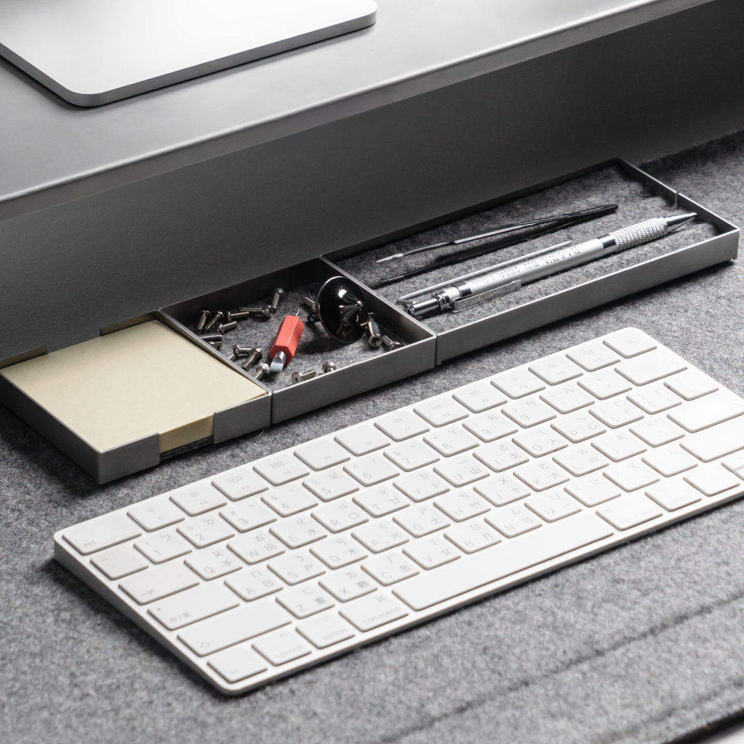 The accessory not only adds a storage space, but a hovering platform for peripherals like phones, cables, hubs, or even an iPad as a second monitor. When not in use, it slides back discreetly.