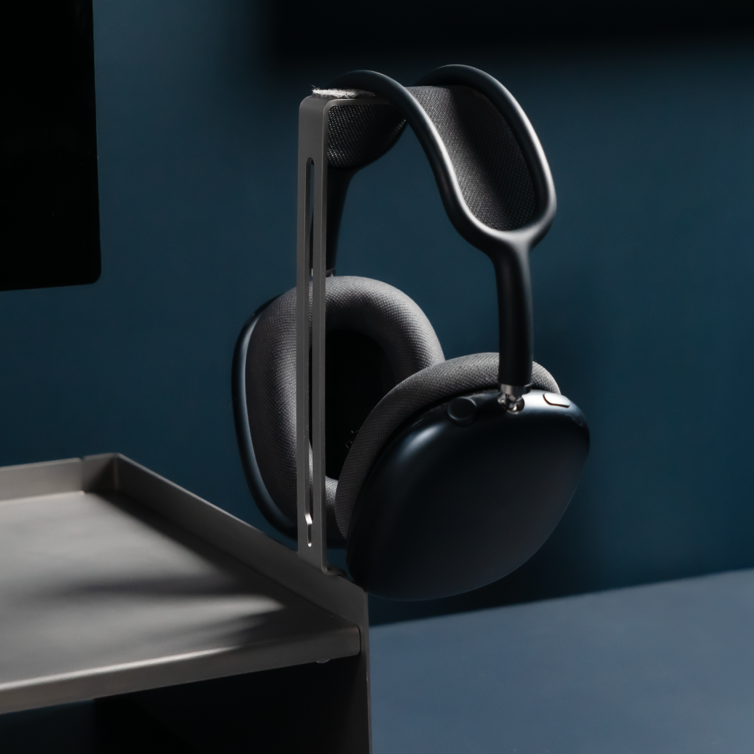 A secure, screw-fixed stand that gives your headphones a proper resting place. The felt-padded top protects the headband, while a slim middle gap routes cords neatly—contributing to a visually calming setup.