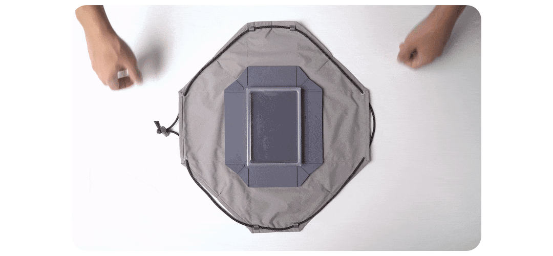 拉起兩邊傘繩成信封狀後,以傘繩環繞固定即可。