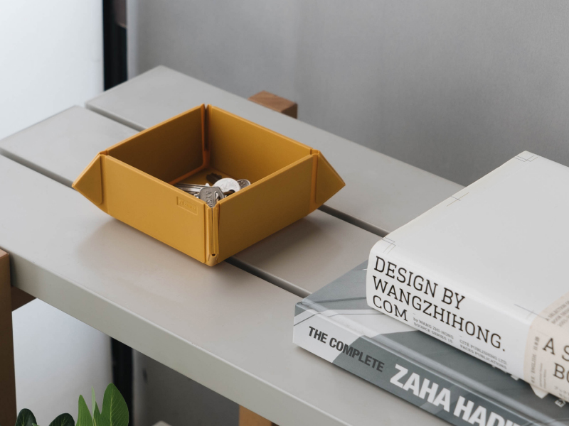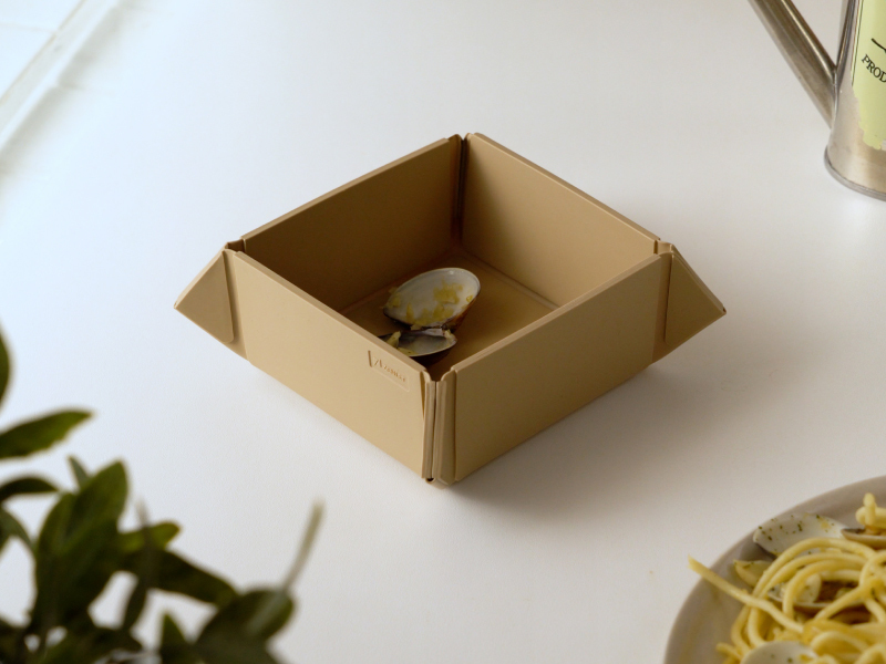Due to the folding and unfolding mechanism, the flat configuration of FoldiBox can be folded and then turned into a three-dimensional box to readily collect your tabletop trash in just one second.