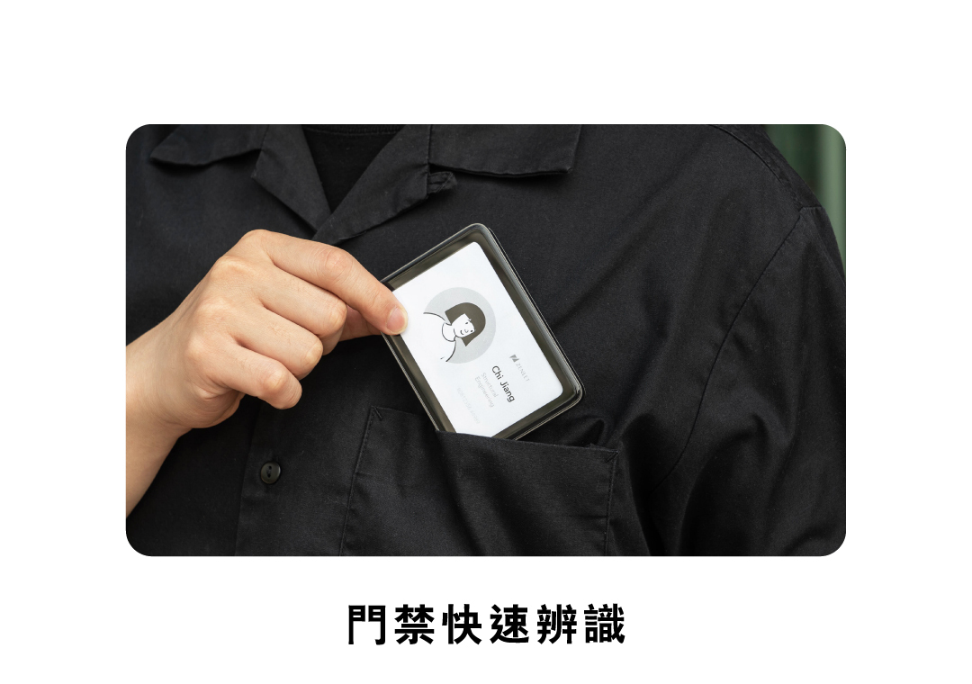 除了能快速感應門禁之外,透明玻璃材質更便於清晰辨識。只需輕鬆拆卸磁吸面板,即可順著卡槽快速放入識別證。