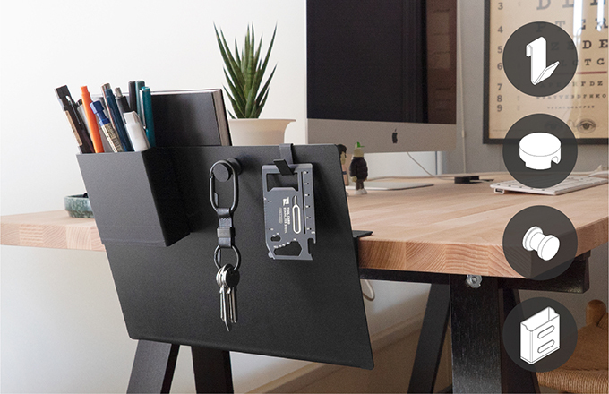可磁吸於邊架內外任何平面形成置物空間,收納筆、尺、釘書機等辦公用品。
