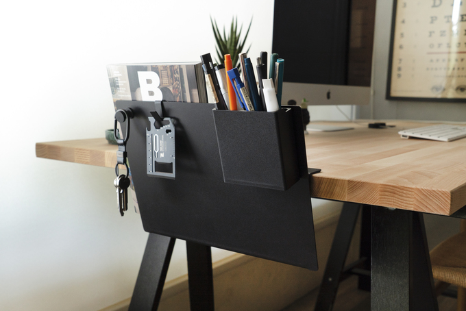 可磁吸於邊架內外任何平面形成置物空間,收納筆、尺、釘書機等辦公用品。