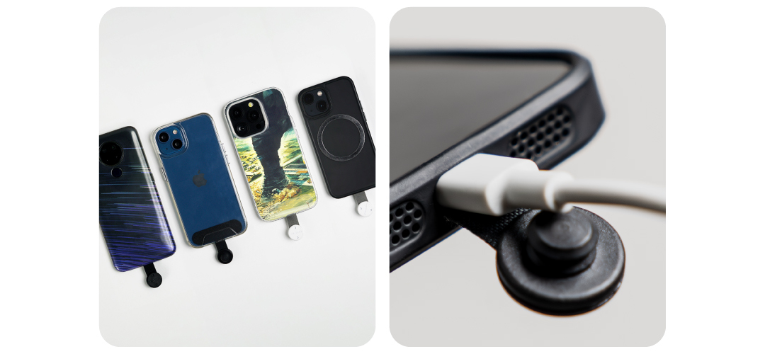 將夾片放入手機殼中,並將尾端穿過充電孔並鎖上固定釦,裝上手機後即完成安裝。