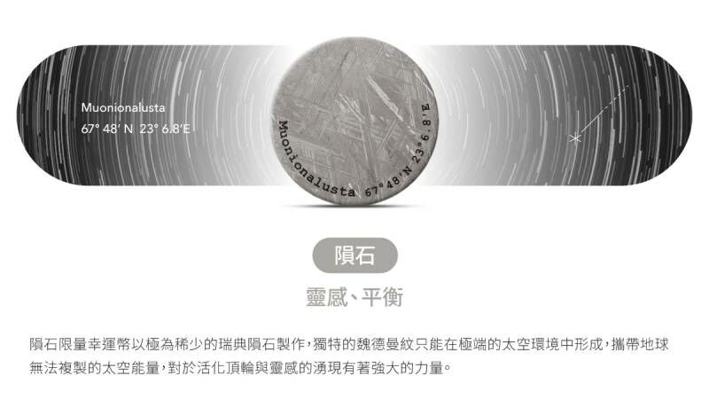 隕石限量幸運幣以極為稀少的瑞典隕石製作,獨特的魏德曼紋只能在極端的太空環境中形成,攜帶地球無法複製的太空能量,對於活化頂輪與靈感的湧現有著強大的力量。
